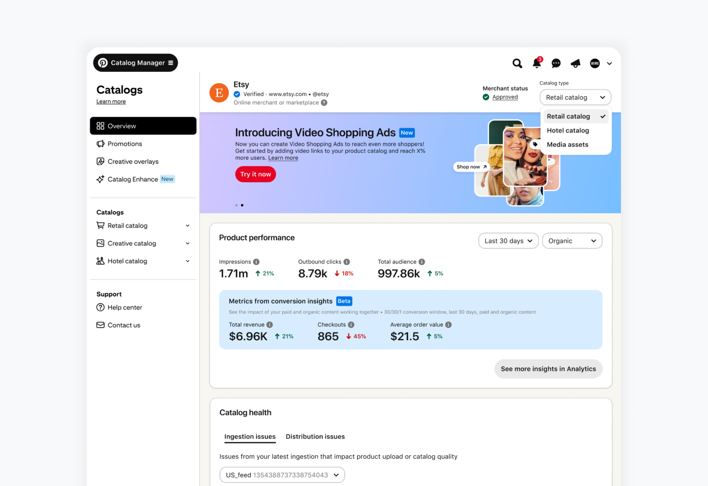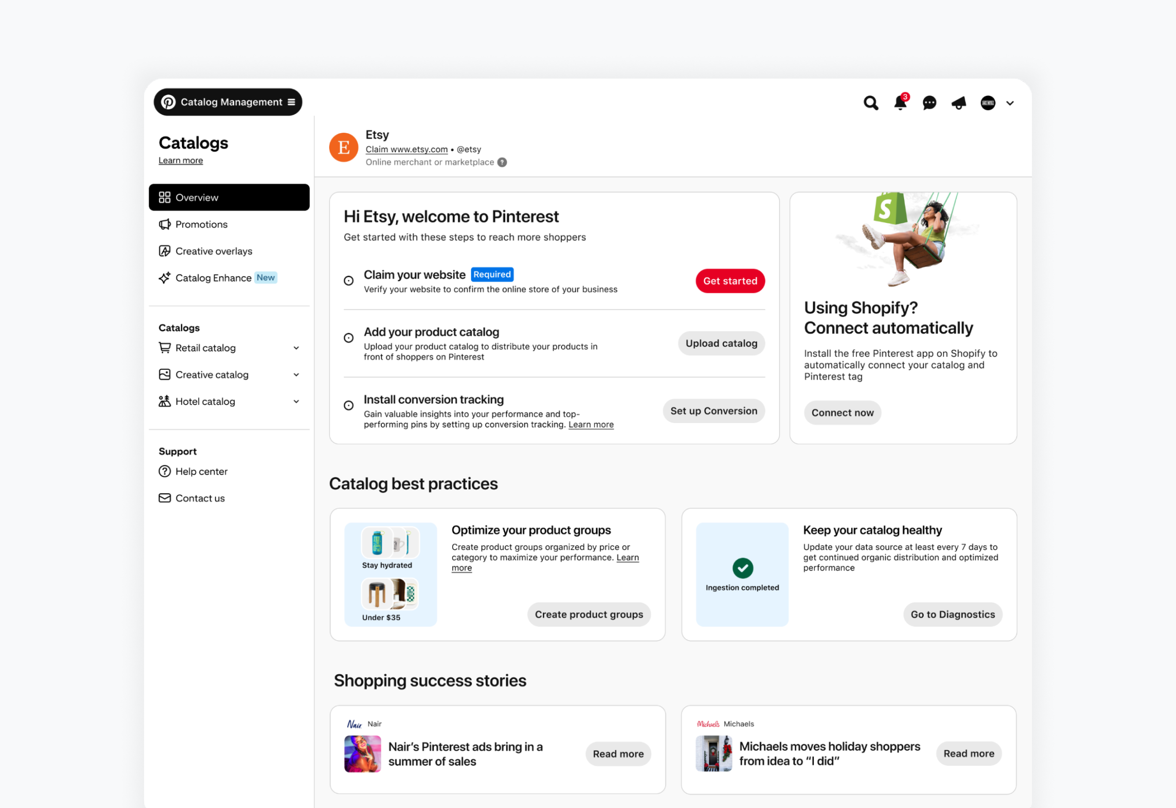 Centralized destination for merchants to onboard, manage, and optimize their product performance. I owned the end-to-end design vision for this platform, partnering closely with cross-functional teams, adjacent product areas, and senior stakeholders to drive alignment and secure executive buy-in — enabling merchants to meaningfully grow their organic presence on Pinterest.