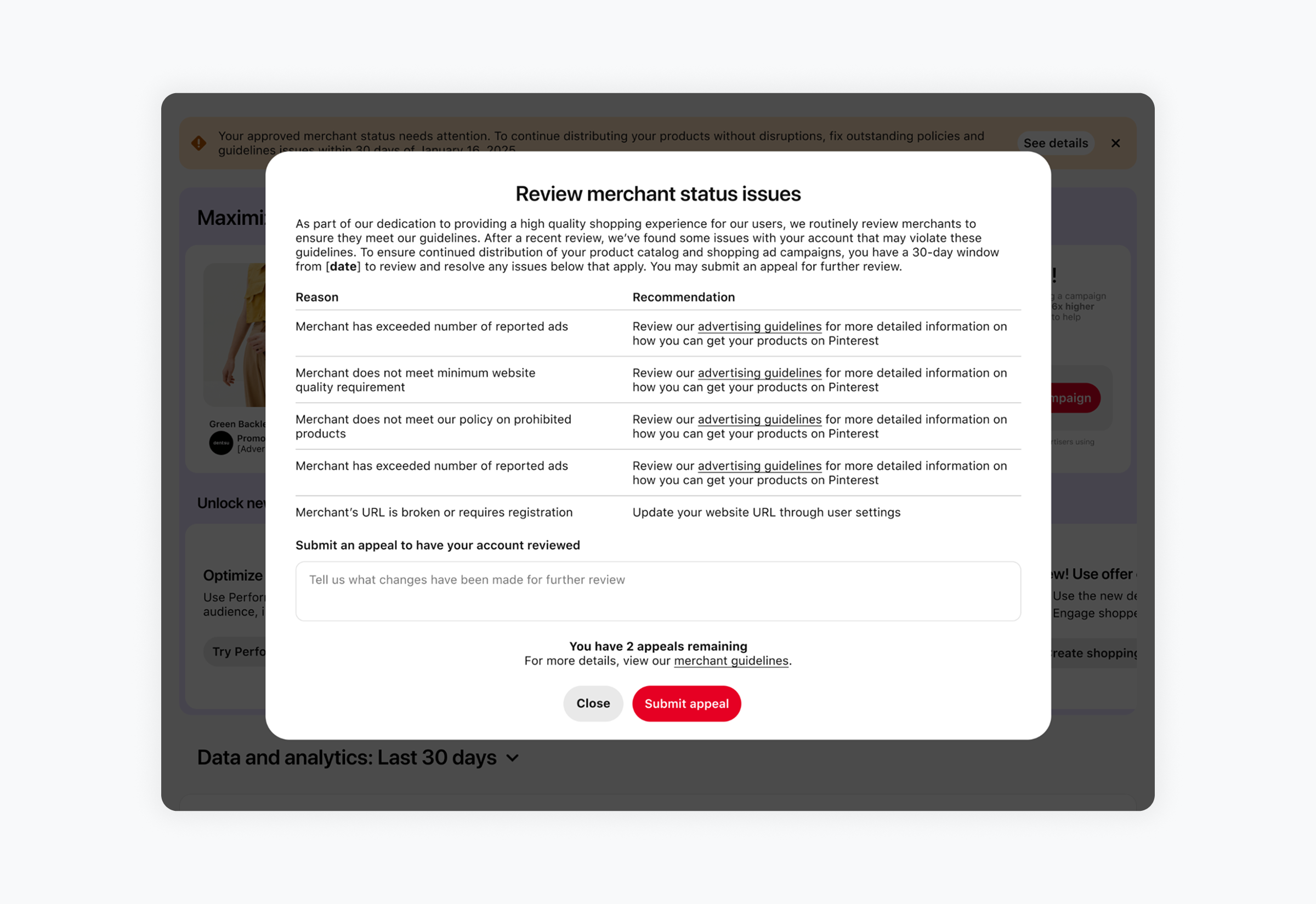 I led a cross-functional workstream—partnering with Research, Marketing, Compliance, and Ops—to provide merchants with a transparent, guided path through the review process. By developing a unified communication strategy that keeps merchants informed at every step, we successfully safeguarded platform integrity and ensured that only the highest quality merchants are featured on Pinterest.